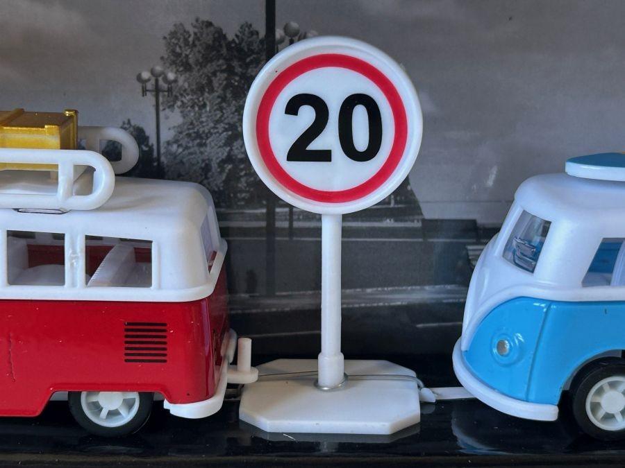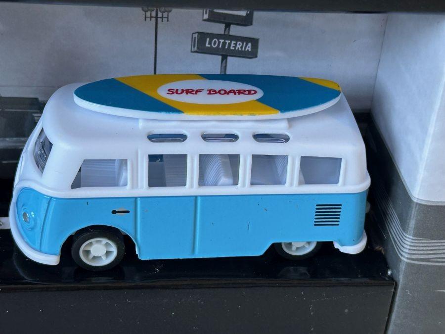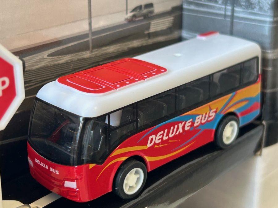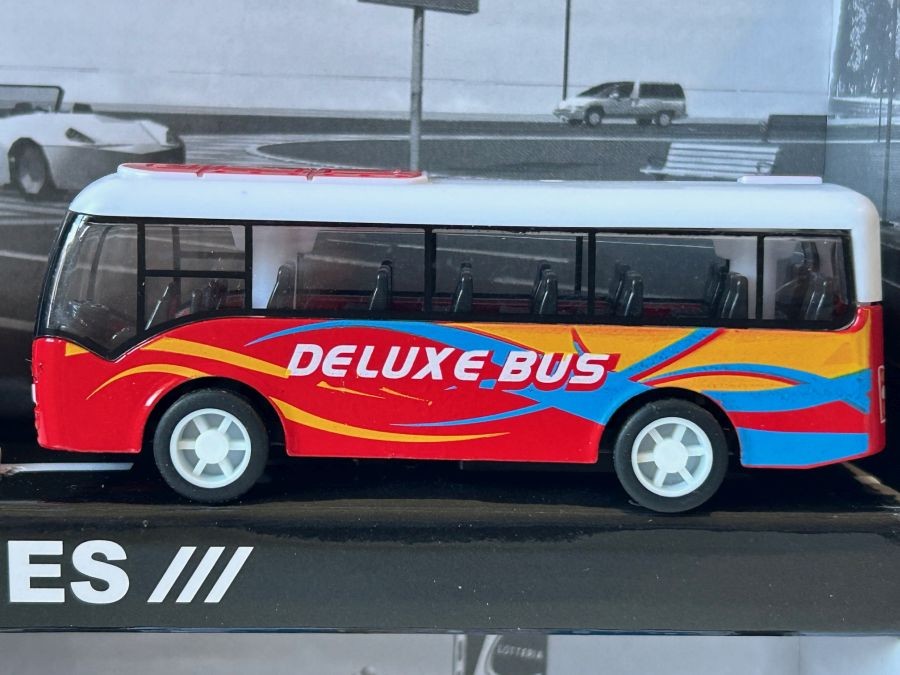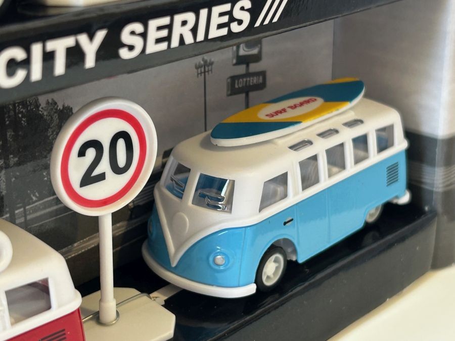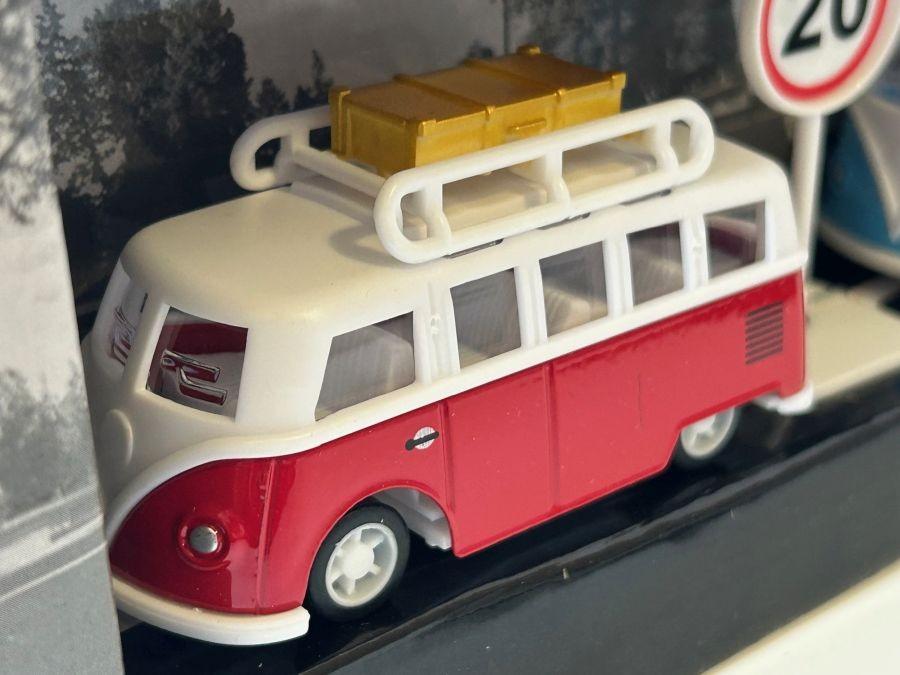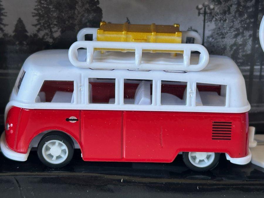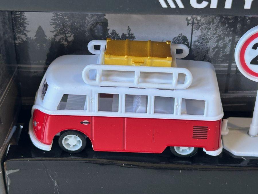 Size (LxWxH, cm): 26x5x18 (approx. box), 9 cm (approx. bus), 8 cm (approx. camper)